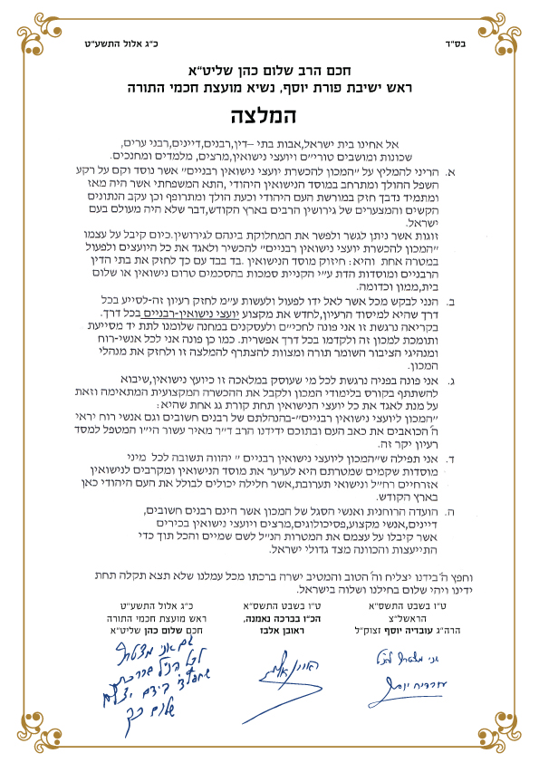 הריני מצטרף להמליץ על המכון להכשרת יועצי נישואין רבניים אשר נוסד וקם על רקע השפל ההולך ומתרחב במוסד הנישואין היהודי. כיום קיבל על עצמו המכון להכשיר ולאגד את כל היועצים ולפעול במטרה אחת חיזק מוסד הנישואין. ומצווה להצטרף להמלצה זו ולחזק את מנהלי המכון. ויהיה שלום בחילנו ושלוה בישראל