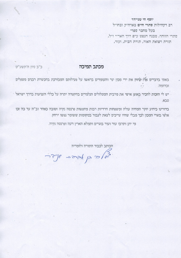 מכתב המלצה מהרב חיים זאיד, הרב המקומי פרדס כץ קרית הרצוג, ר"מ ישיבת נחלת שלמה , בני ברק.